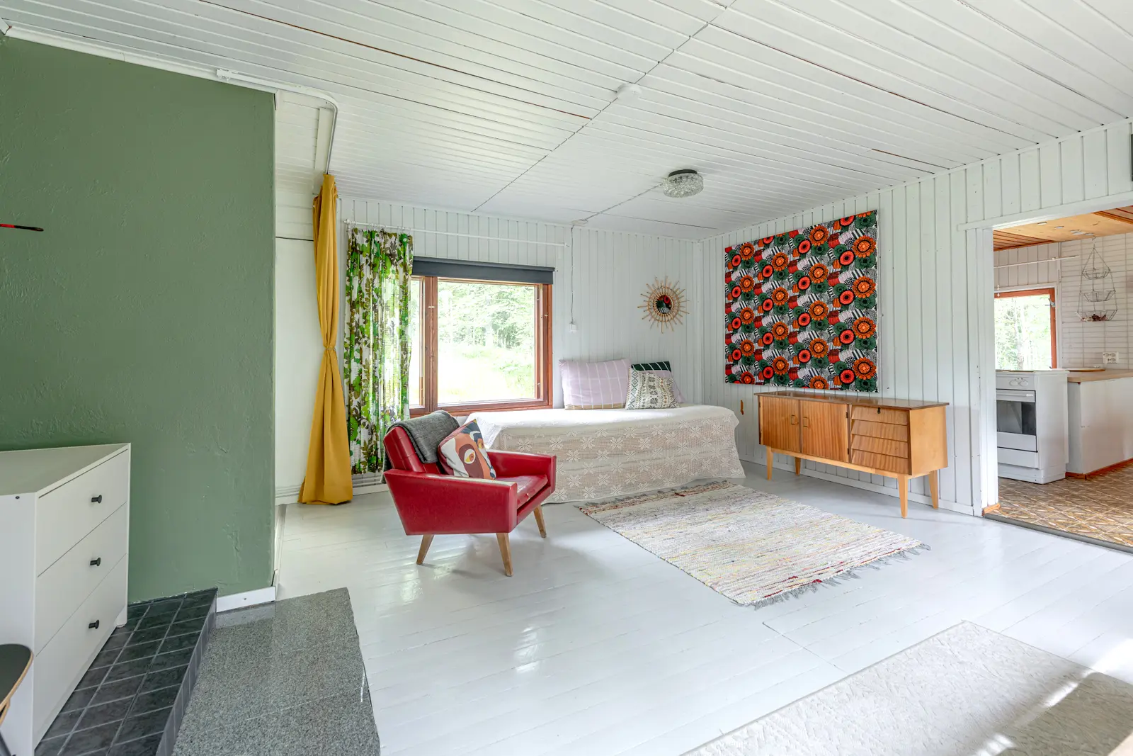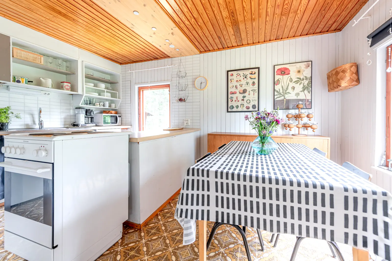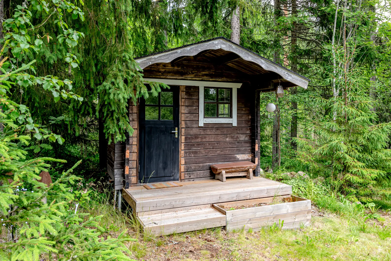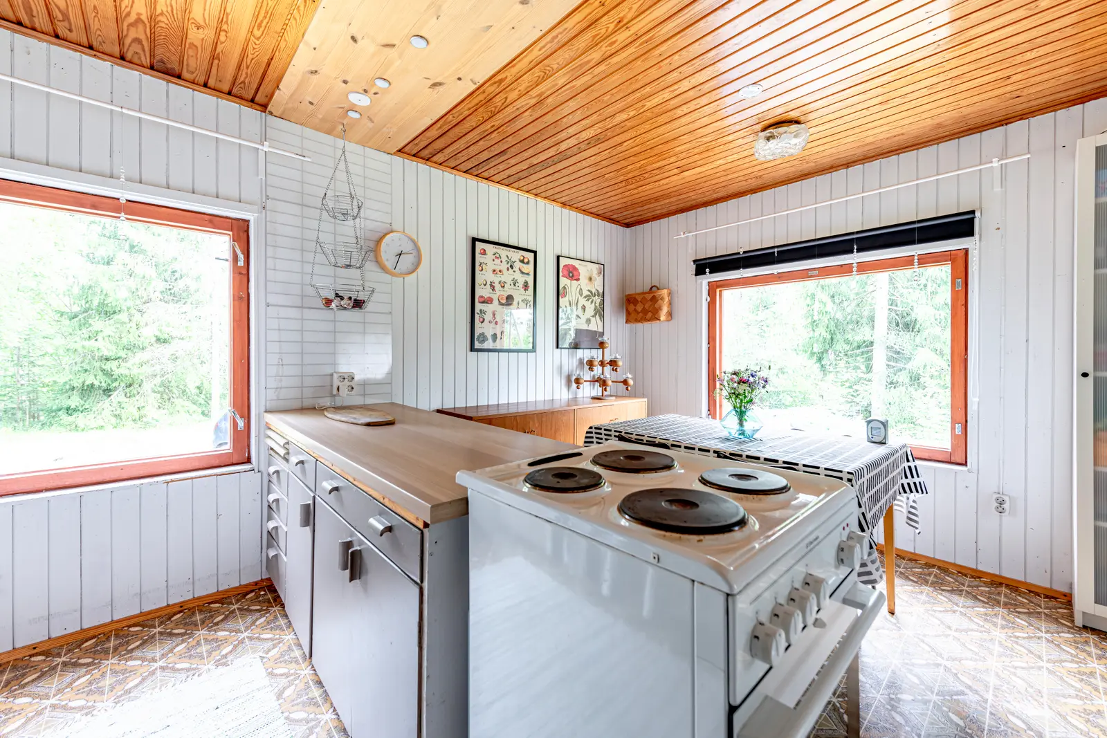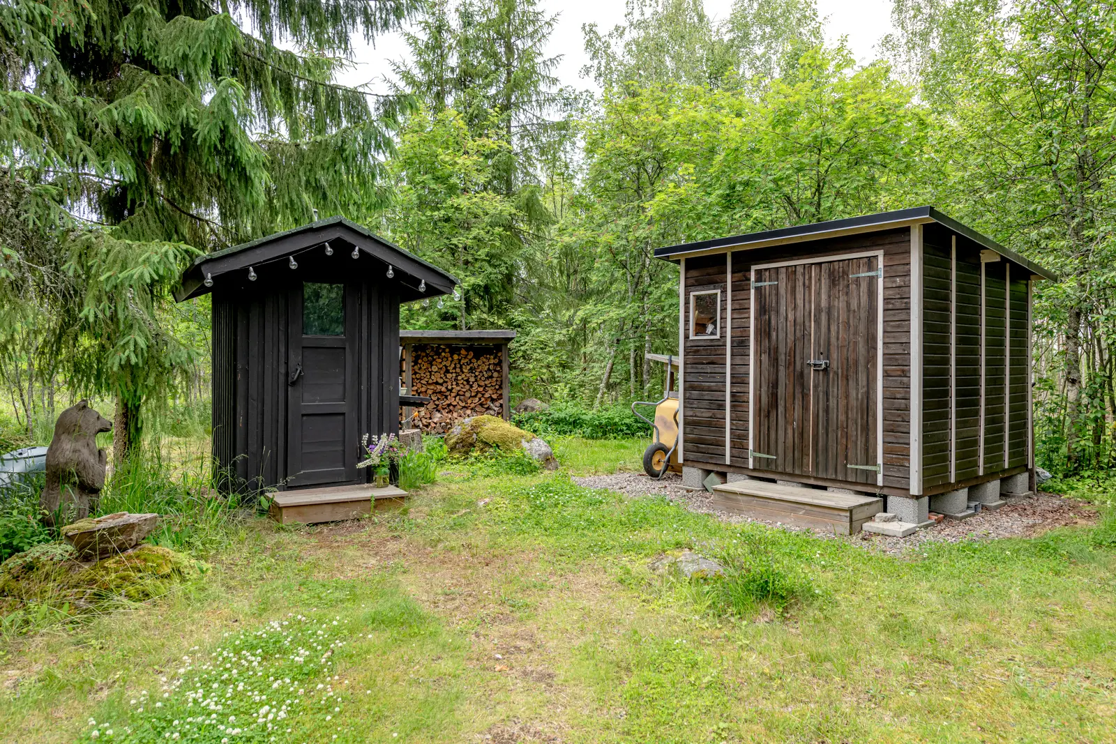 Sisällä on toimiva kokonaisuus: erillinen keittiö saarekkeineen, valoisa olohuone (takkavaraus), pukuhuone/makuuhuone ja sauna. Pihapiirissä on lisäksi kesäkeittiö, puucee, nukkuma-aitta sekä kylmiä varastotiloja. 2780 m² puutarhatontti tarjoaa nurmea, istutuksia ja puustoa. Luonto on lähellä, mutta hiekkateitä pitkin mökille ei tarvitse ajaa.