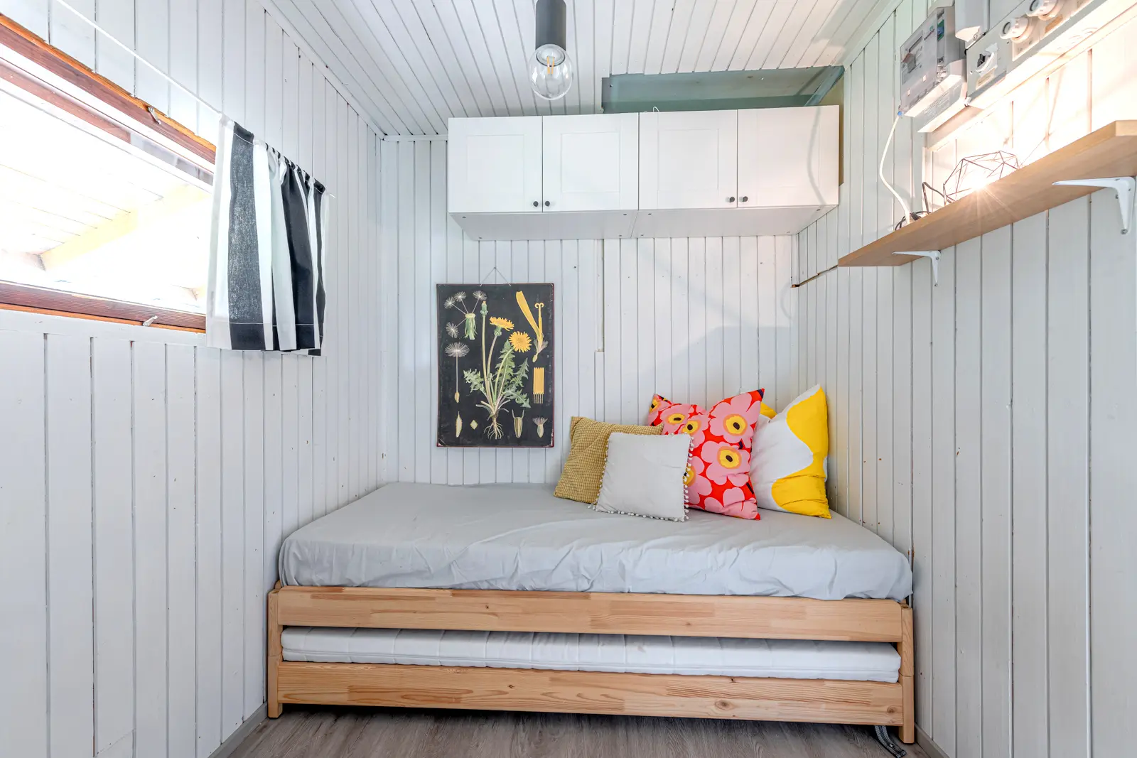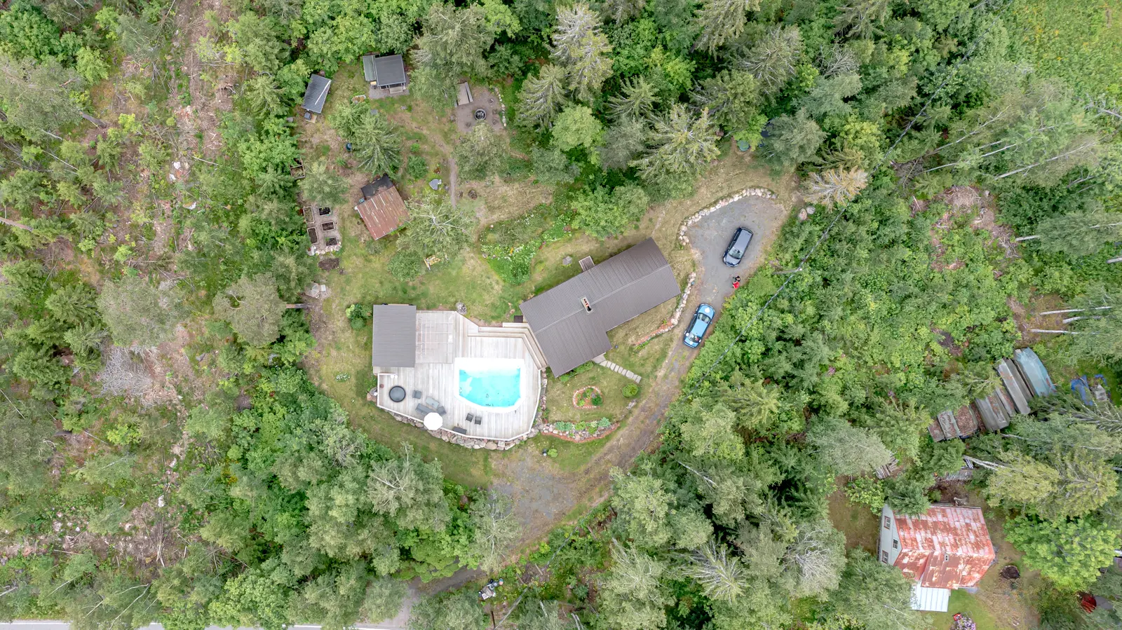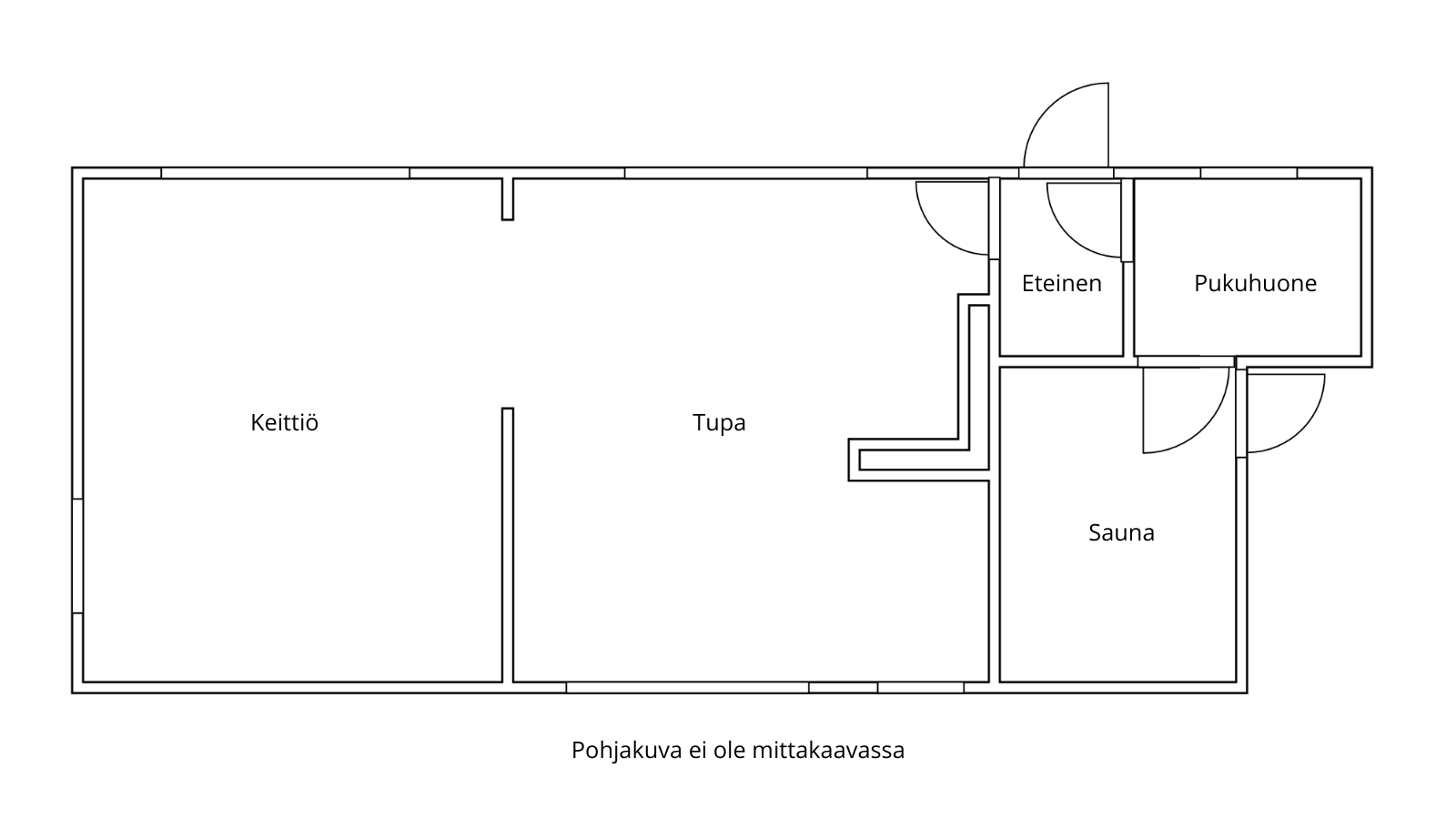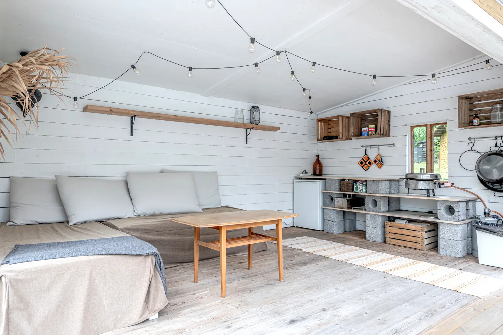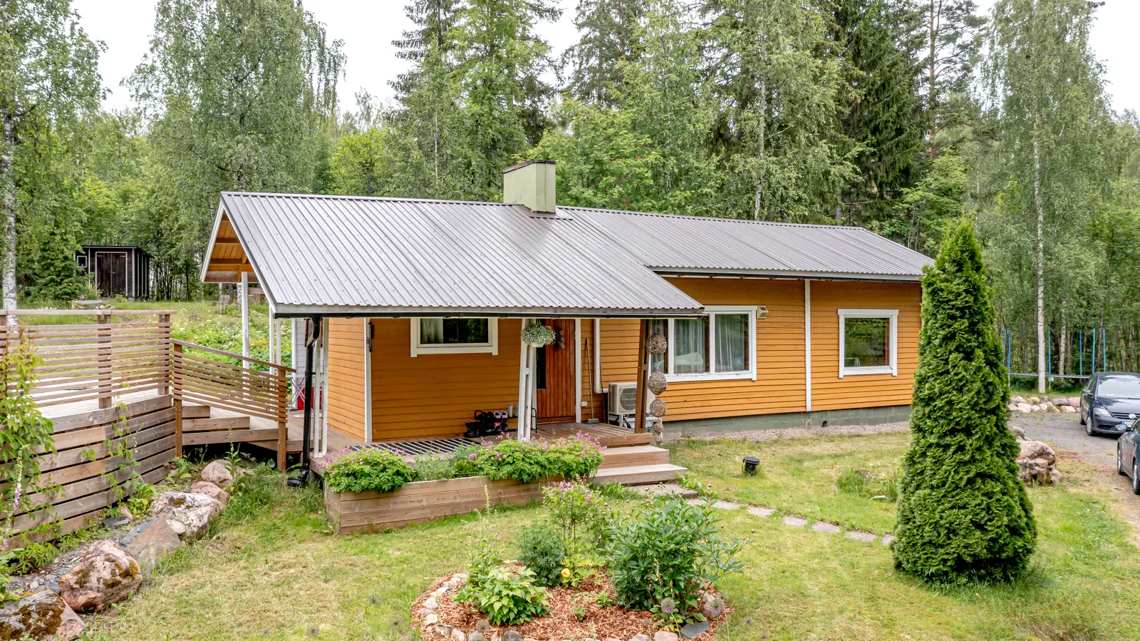 Sisällä on toimiva kokonaisuus: erillinen keittiö saarekkeineen, valoisa olohuone (takkavaraus), pukuhuone/makuuhuone ja sauna. Pihapiirissä on lisäksi kesäkeittiö, puucee, nukkuma-aitta sekä kylmiä varastotiloja. 2780 m² puutarhatontti tarjoaa nurmea, istutuksia ja puustoa. Luonto on lähellä, mutta hiekkateitä pitkin mökille ei tarvitse ajaa.