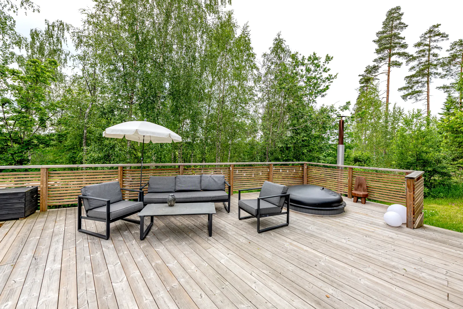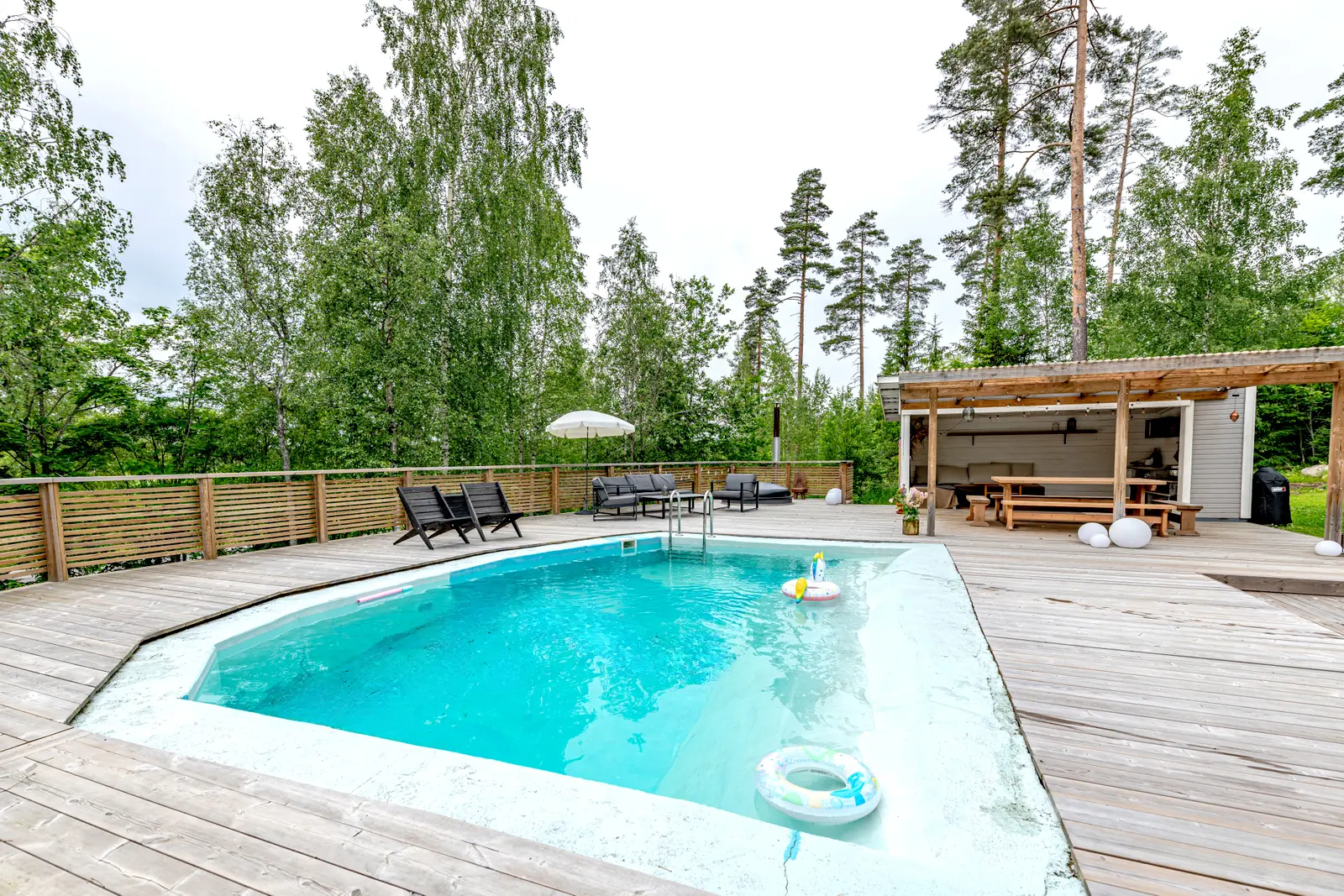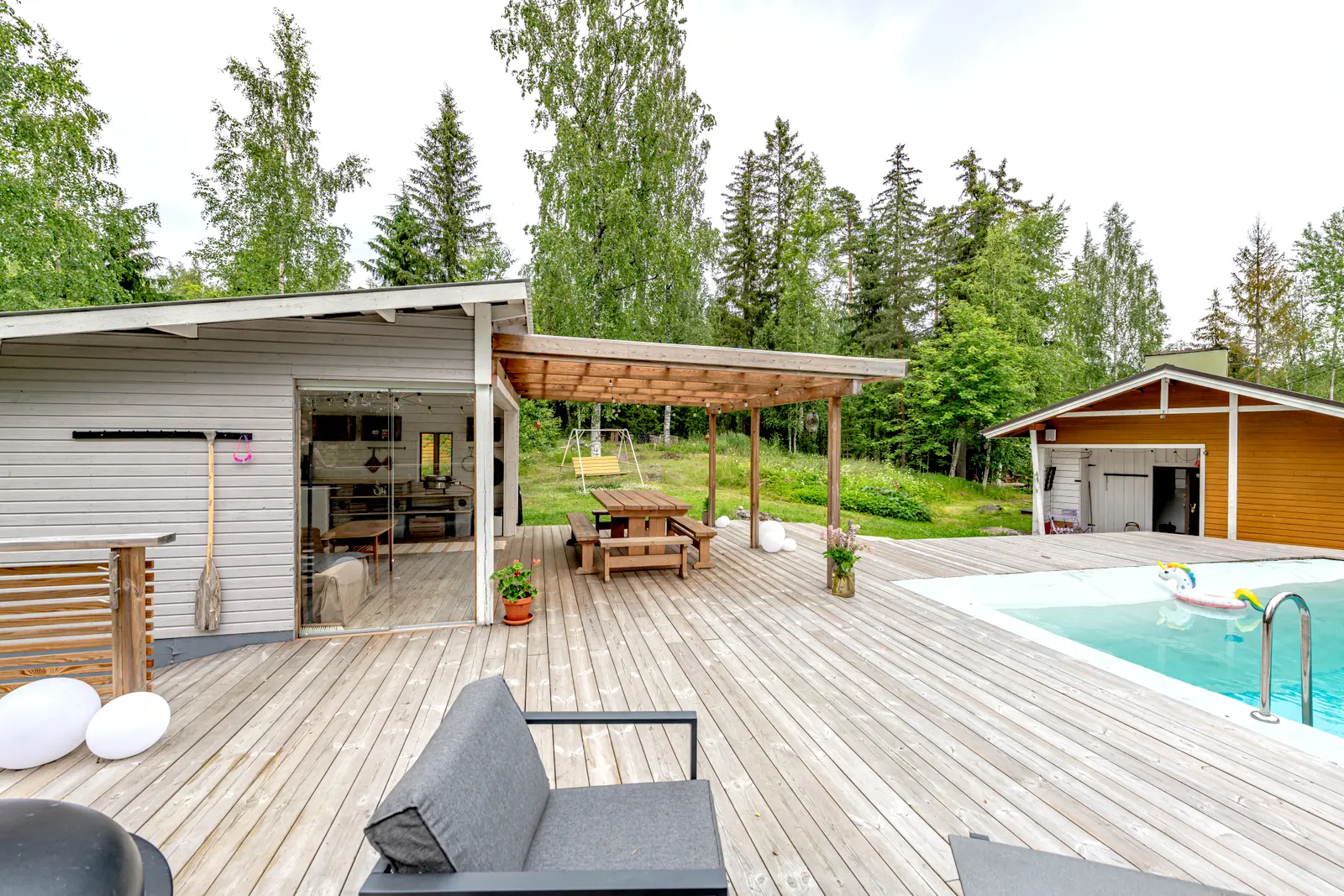 Himmilä on kesäelämän keskus: uima-allas, palju ilta-aurinkoon ja iso terassi kesäkeittiön yhteydessä tekevät pihasta oman lomakeitaan.