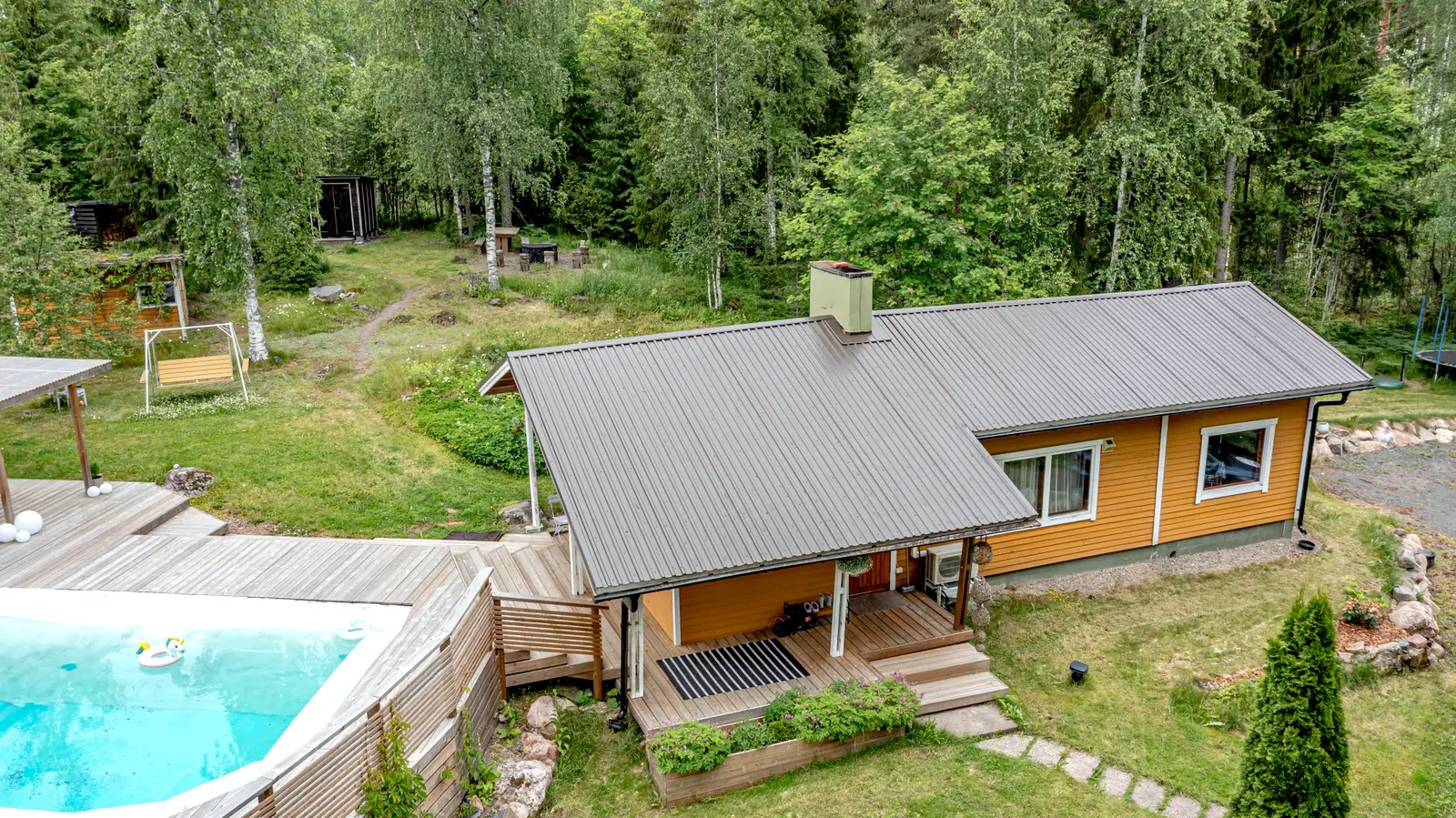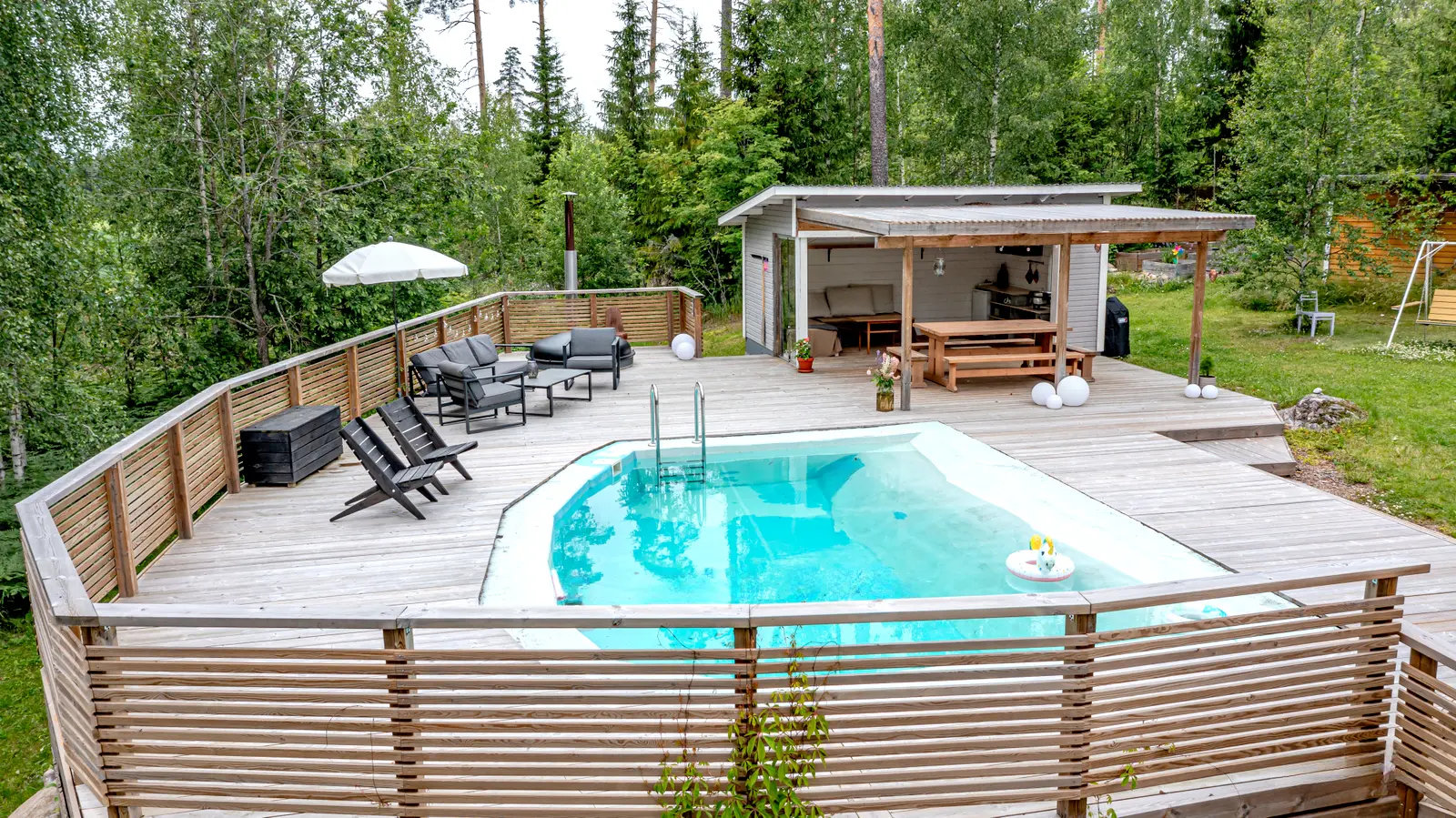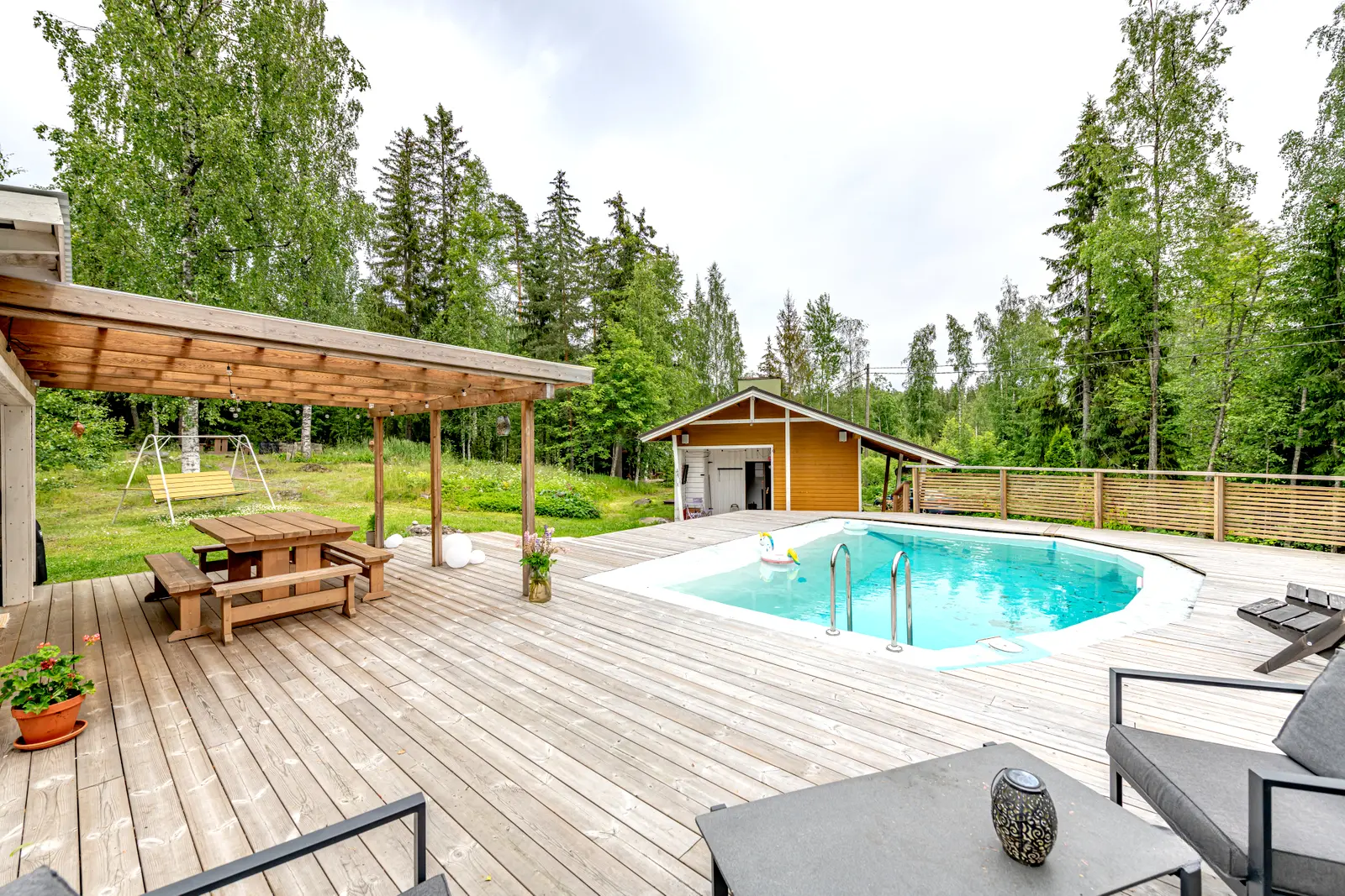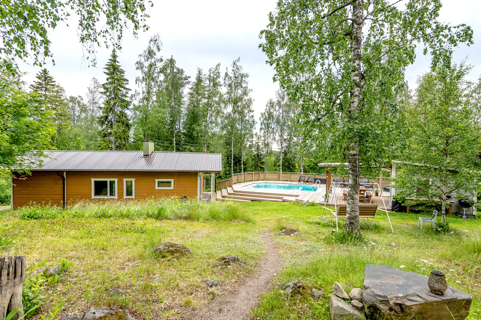 Himmilä on kesäelämän keskus: uima-allas, palju ilta-aurinkoon ja iso terassi kesäkeittiön yhteydessä tekevät pihasta oman lomakeitaan.