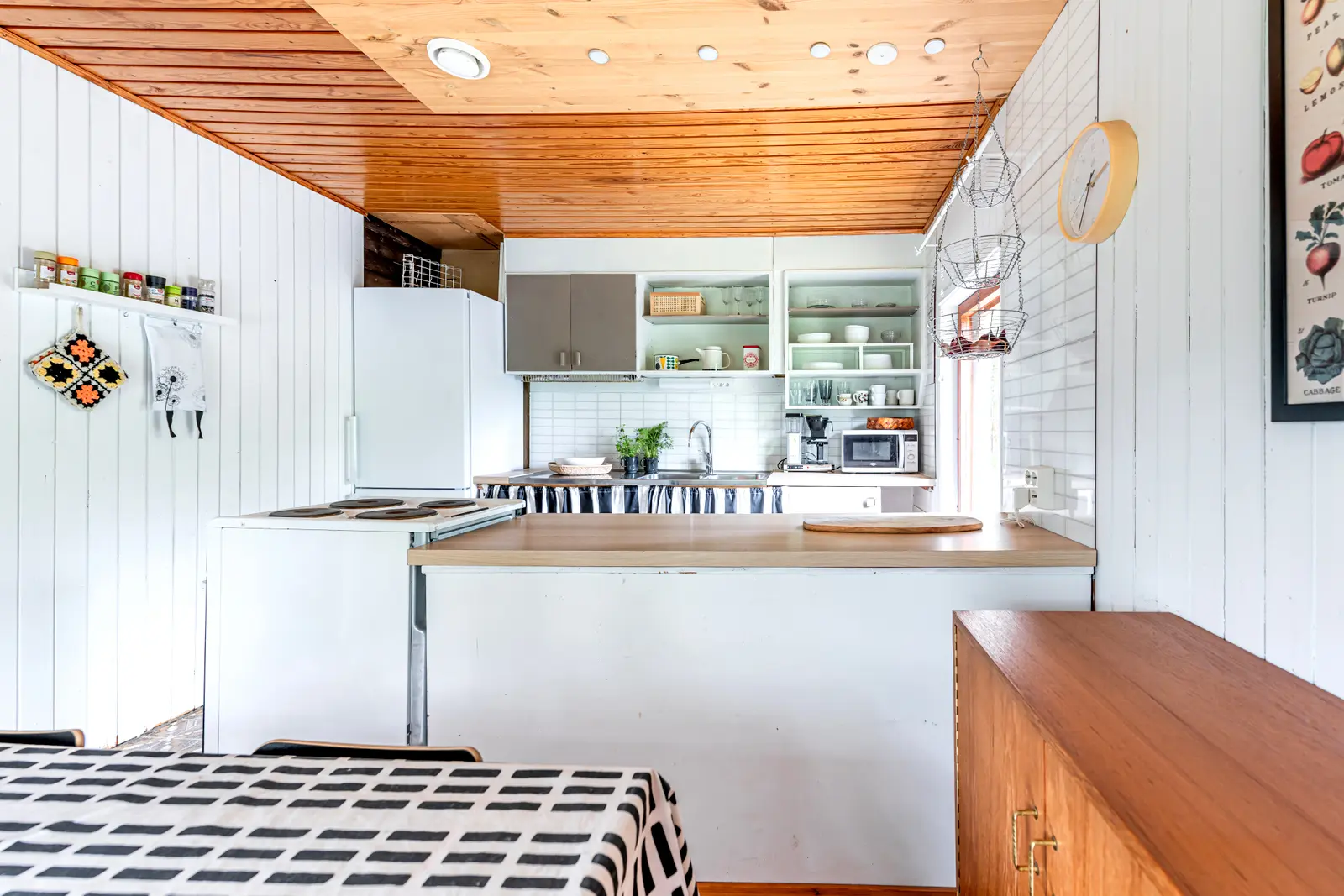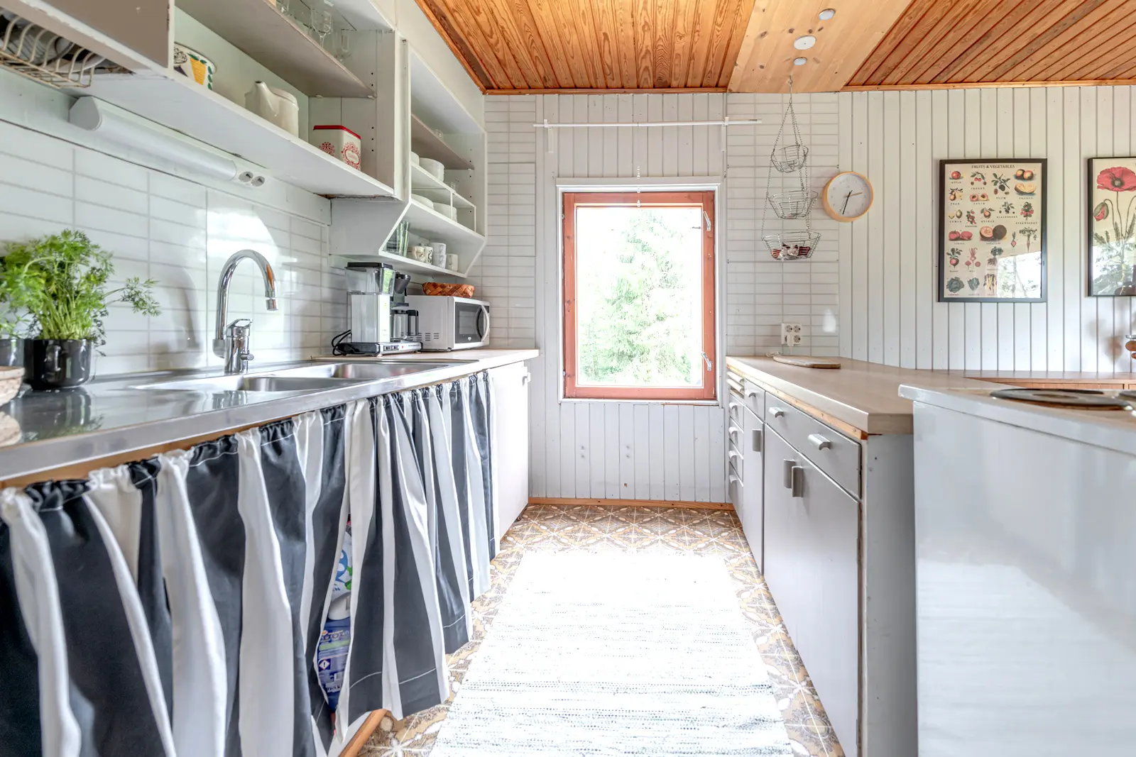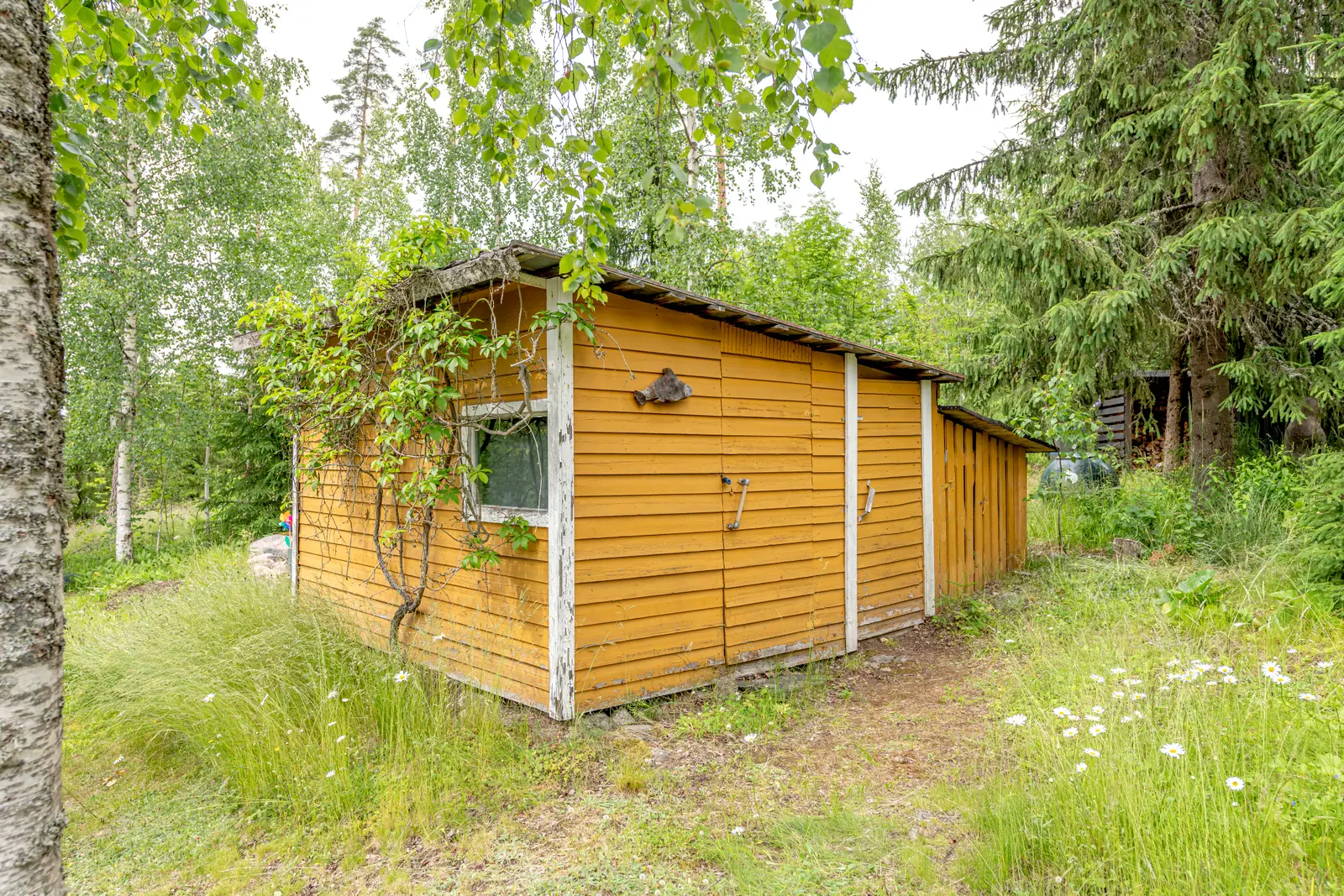 Sisällä on toimiva kokonaisuus: erillinen keittiö saarekkeineen, valoisa olohuone (takkavaraus), pukuhuone/makuuhuone ja sauna. Pihapiirissä on lisäksi kesäkeittiö, puucee, nukkuma-aitta sekä kylmiä varastotiloja. 2780 m² puutarhatontti tarjoaa nurmea, istutuksia ja puustoa. Luonto on lähellä, mutta hiekkateitä pitkin mökille ei tarvitse ajaa.
